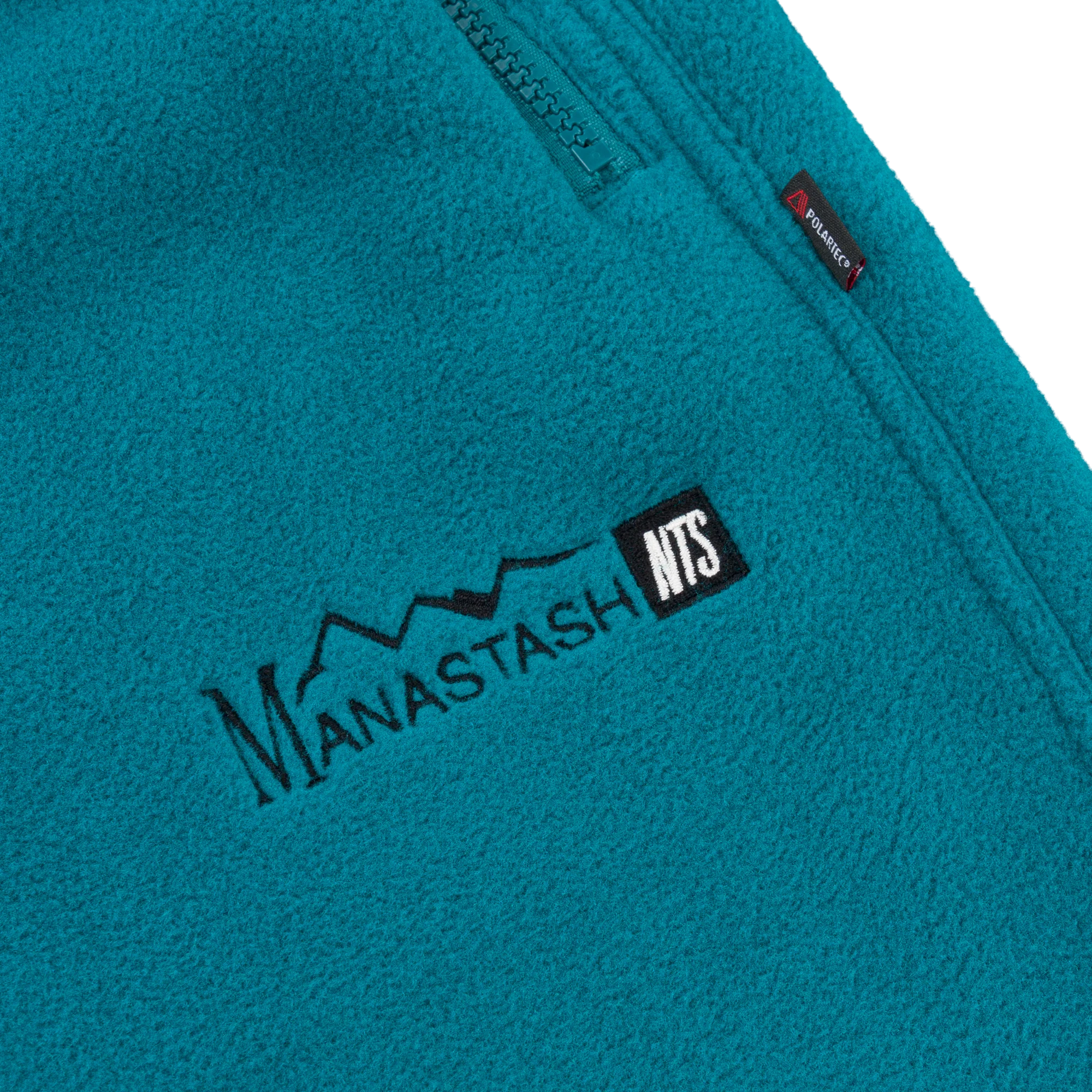 Teal technical Polartec 200 pants with embroidered collaboration logo. Suitable for all terrains: the NTS x Manastash Polartec 200 pants keep you warm when it's cold out, dry when it's wet out, and mad cosy when you're home.