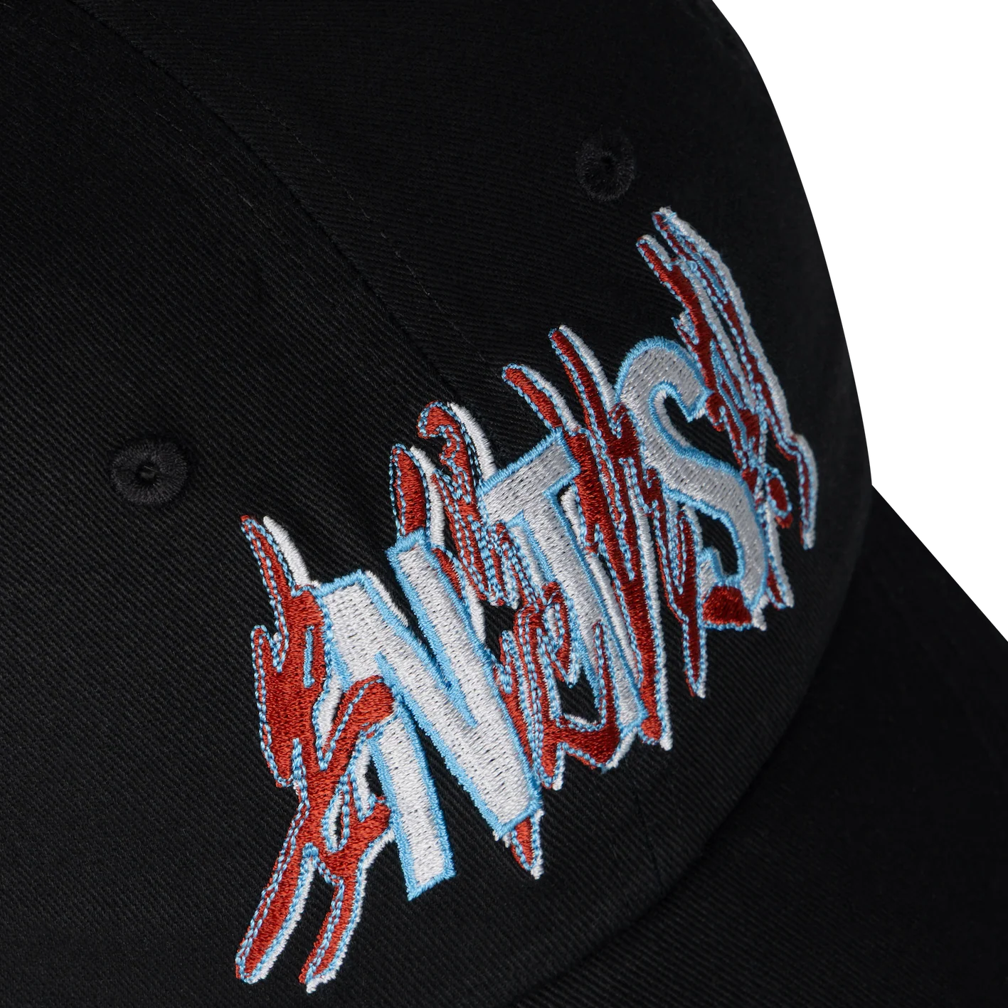 Neon NTS type and calligraphy, embroidered with love on a black strapback cotton cap.
